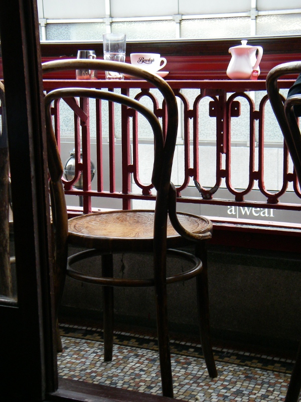 We sat close to the windows.  Perhaps next time we will grab a cup of tea and sit on the balcony.  The dining room contains very Paris-bistro looking tables, with square tops made of dark marble and well worn iron bases. The high backed purple velvet chairs were comfortable. The room gets its name from the balcony where customers can sit and watch street traffic down below. The balcony itself is hardly more than a wooden railing to place your cup, and deep enough for a single row of chairs. They have a red awning to keep the rain off patrons which they needed to employ because of a sudden and very Irish downpour. Herself and I were quite cozy at our table with our coffee & tea. I felt sorry for the street musicians down below in Grafton Street and the throngs of summer tourists caught without their umbrellas. It was a swift and lashing rain, which mockingly lasted only 5 minutes. We were delighted not to be in it.
